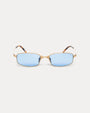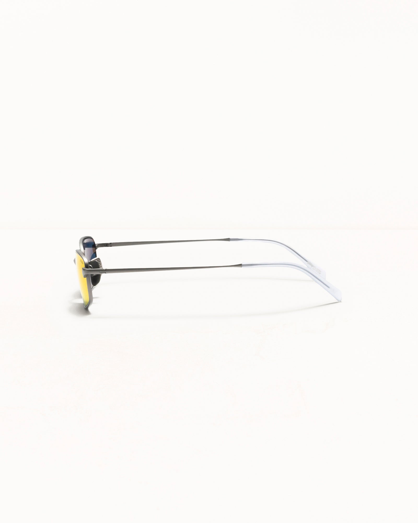 Narrow rectangular frames with slim temples and shiny transparent tips. Handmade in lightweight yet durable matte silver titanium with sunflare mirror recycled lenses. Features laser-engraved logo detailing at the lens corner and debossed nose pads. - 100% UVA/UVB protection - Five barrel hinges - Unisex - Slimmer fit - Frame width: 5.2" / 132.1mm - Frame material: 100% titanium - Lens material: 100% nylon (50% recycled) - Includes branded case and cleaning cloth - Made in Japan